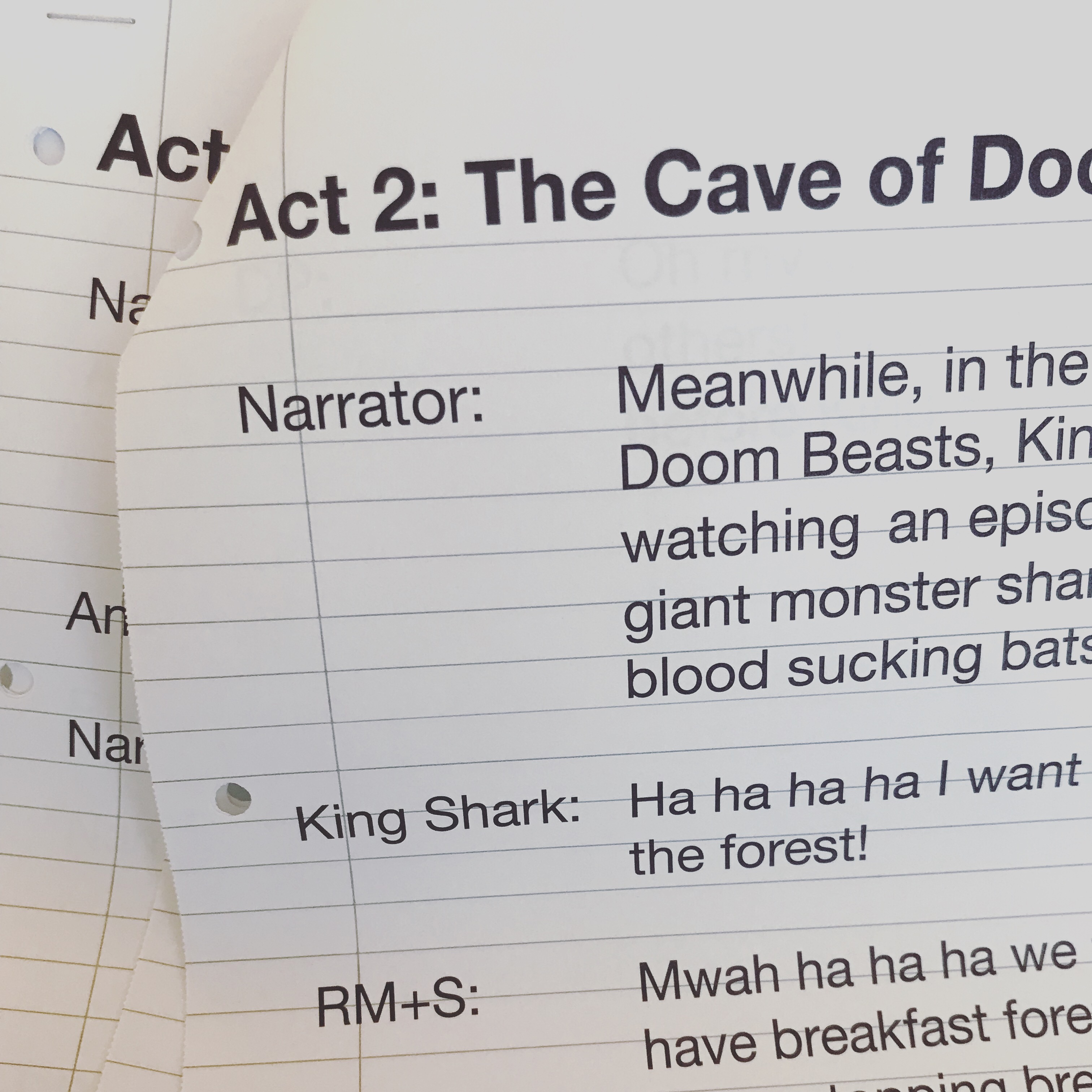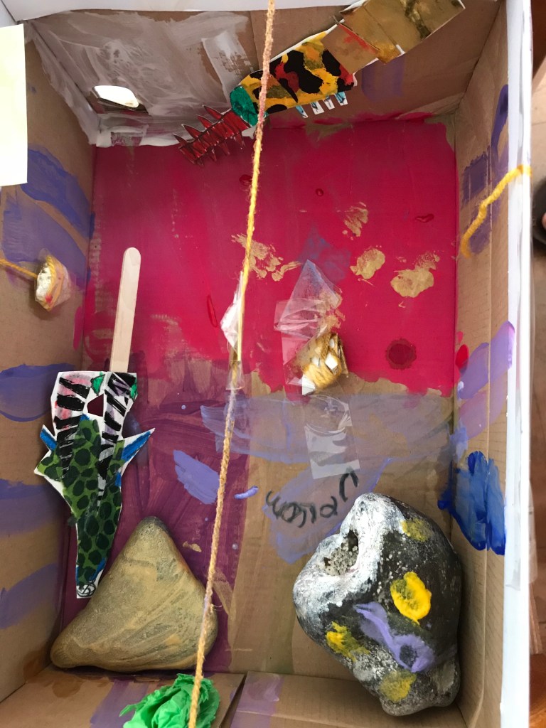 In weekend and holiday community sessions in 2018-2019 we co-wrote scripts which we produced into short plays that we made puppets and settings for and performed to parents/carers. Stories include: King Shark, Zoo Taken Over by Monsters, Monster Play.