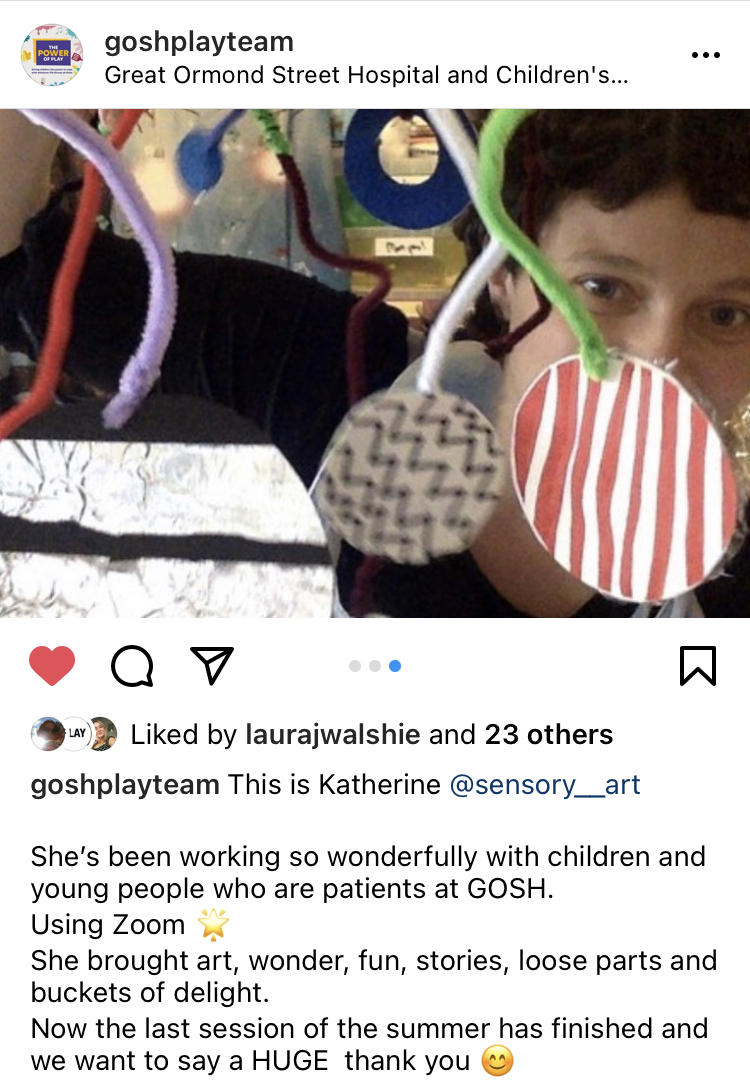 Between 2019 and 2021 I ran sensory storytelling sessions with the GOSH Play Team, initially on zoom and then in person on Lion, Elephant and Giraffe Wards (oncology).
